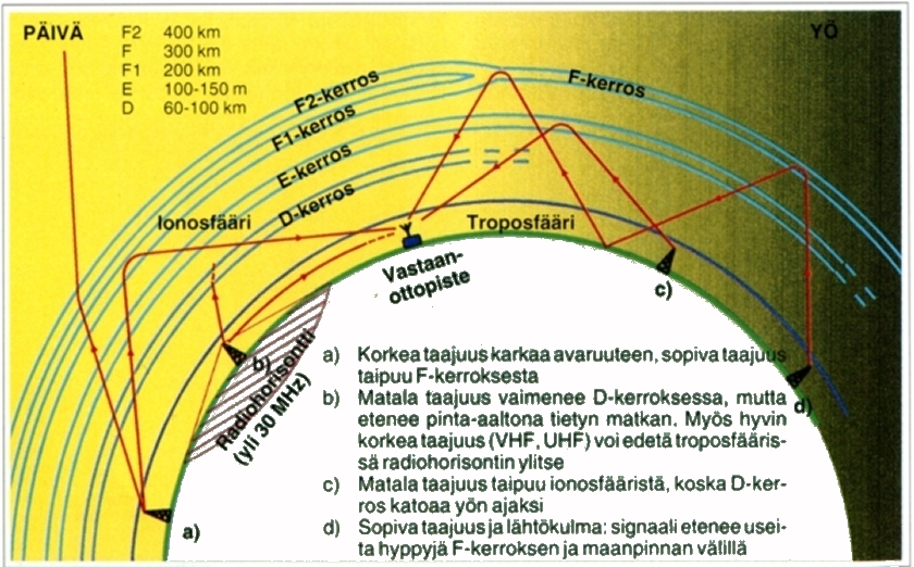 Avaruuksiin singottu signaali menisi sinne menojaan, ellei maapalloa peittäisi ilmakehä ja ilmakehässä ionosfääri 50-400 km korkeudella. Näissä yläkerroksissa auringon säteily ionisoi kaasumolekyylejä, mikä tekee niistä heijastavia. Radiosignaali maasta kimpoaa ionosfääristä takaisin kuin peilistä. Näin tulee mahdolliseksi lähettää lyhytaaltosignaali maapallon toiselle puolelle saakka.