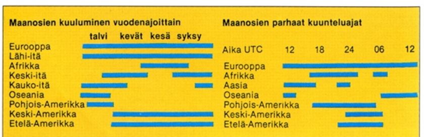Lähetystaajuuksien eteneminen vastaanottajalle riippuu paljon kellonajasta, jopa vuodenajasta. Pimeän aikaan matalat taajuudet; keskiaallot, alimmat lyhytaaltotaajuudet, kuuluvat parhaiten. Valoisan aikaan keskellä päivää kuuluvat korkeat taajuudet (15000 kHz ->) parhaiten.