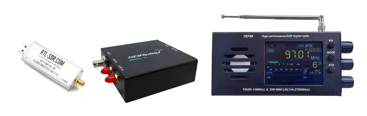 Harrastajalaitteiden hintaluokassa halvimmasta päästä on RTL-SDR, USB-porttiin suoraan liitettävä tikkuradio, jonka ominaisuudet ovat vaatimattomat. A/D-muunnin on tyypillisesti 8-bittinen. Hinta 20-30 euroa.