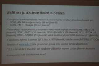 Sunnuntaina hallituksen kyselytunnilla ruodittiin jäsenkyselyn tuloksia. Kolme henkilöä oli tyytymättömiä liiton verkkosivuihin. Webbiä kuitenkin lukee yli 60% vastanneista, joten ahkerampi uutisointi ja tiedotus kotisivulla olisi hyvä idea. Kansainvälisen toiminnan katsaus oli lyhyt ja ytimekäs: kansainvälinen toiminta on surkastunutta. Lipunlaskun jälkeen yksi autollinen matkasi Kouvolan koti-, kotiradio-, radio- ja sotilasradiomuseoon, jossa oli loistavaa nähtävää, mm. unkarilaisten sodanaikainen laite, jollaiset kaikki tuhottiin Unkarissa neuvostojoukkojen määräyksestä. Oppaanamme toimi Ilmo Matula.